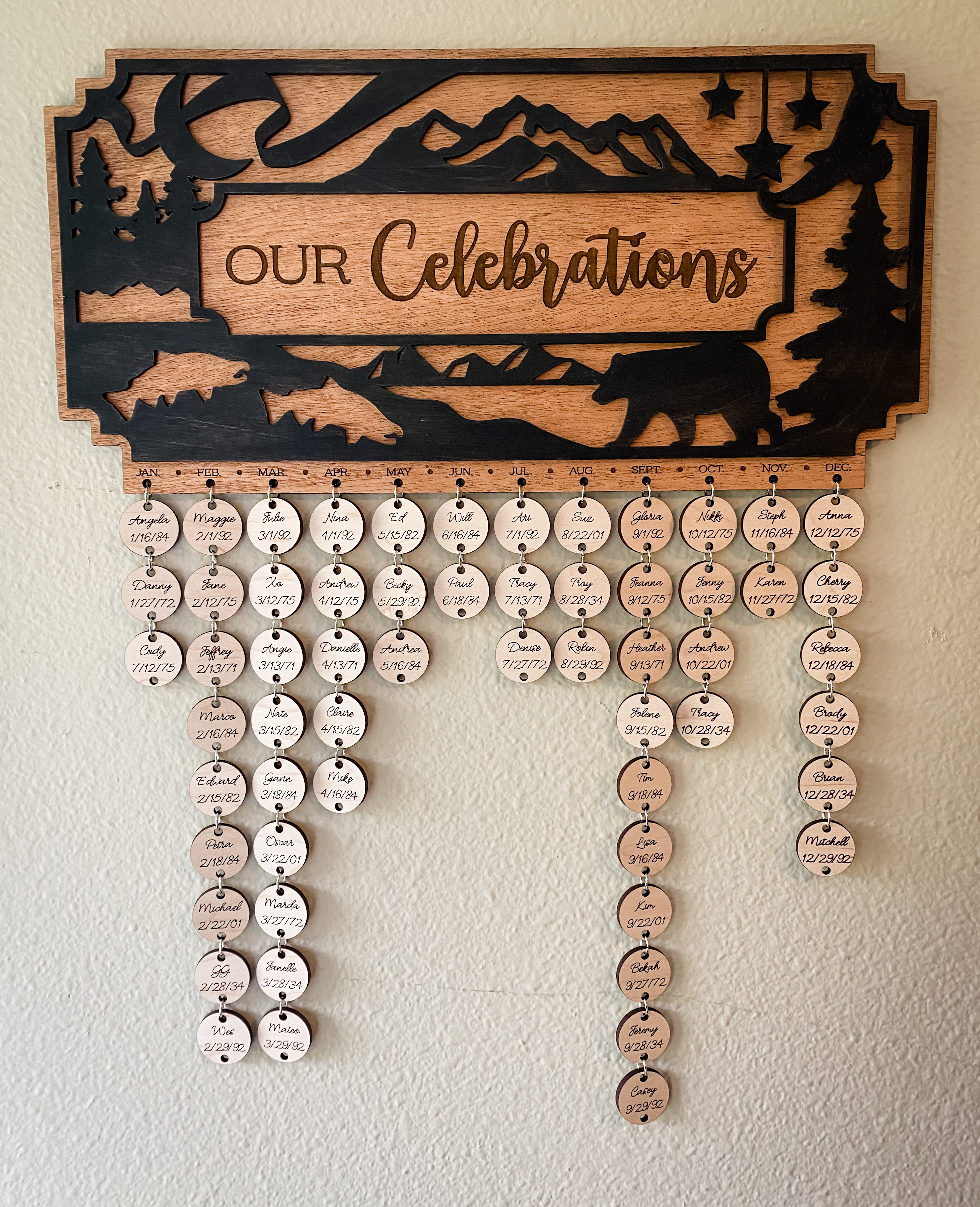 These beautiful, multi-layer, multi-option celebration signs can be made to match any decor or style. Add a family name or message, hanging ‘coins’ that can be engraved with names and important dates. Makes a great gift for a new family, grandparents or a new home! Our Celebration Signs are custom made with your style in mind. Choose your preferred shade of stain and/or paint, hanging coins or plain, and front image. The hanging coins are a great way to remember birthdays and other important events.
